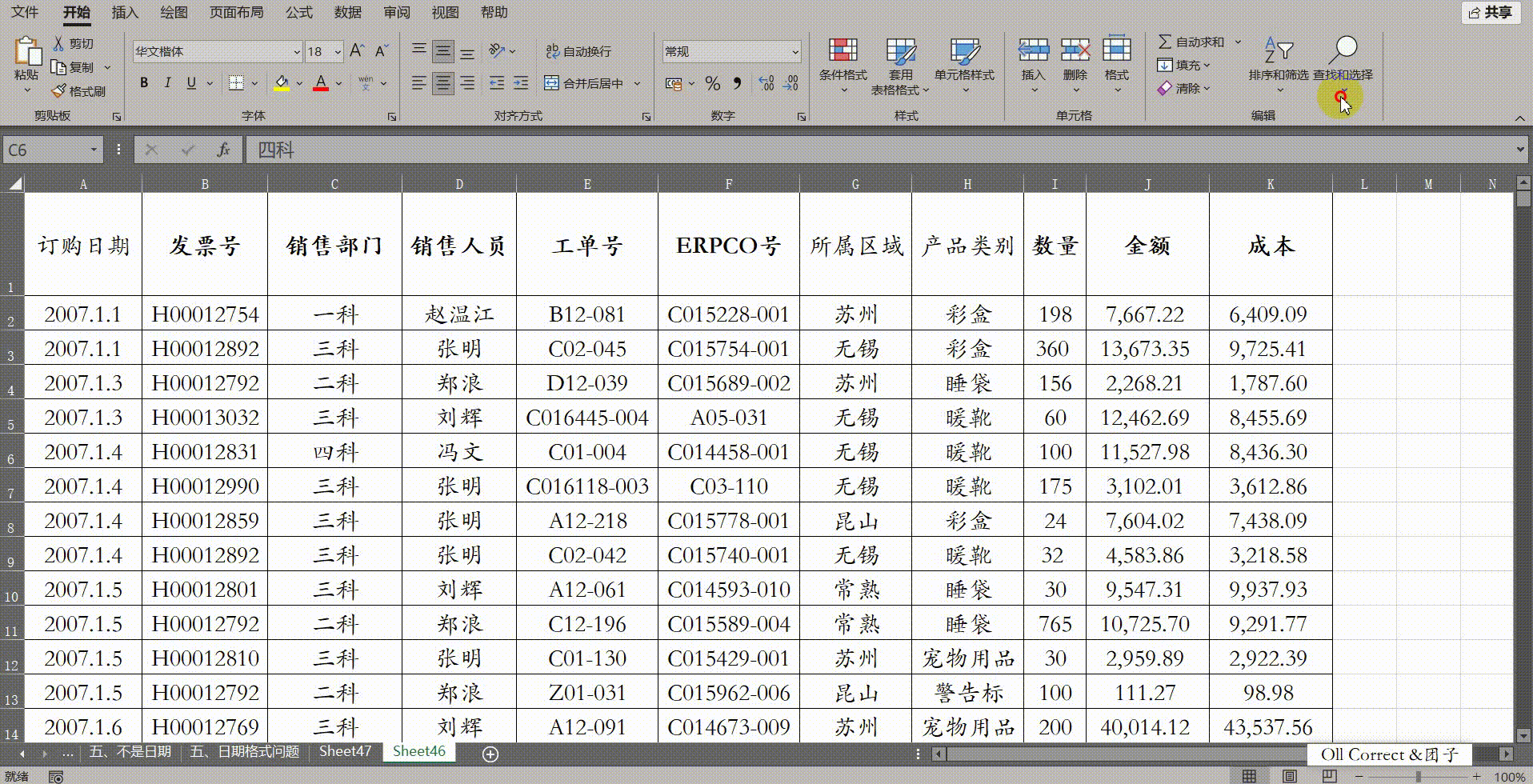 操作步骤: 首先,选中原始数据表中包含日期的列(或点击任意单元格),点击【开始】选项卡右侧的【查找和选择】,选择【替换(R)】(或者直接按下快捷键Ctrl+H)。在弹出的【查找和替换】窗口中,【查找内容(++N++ )】输入英文状态下的小数点".",【替换为(++E++ )】输入短横线"-",点击【全部替换(++A++ )】。此时所有的"2007.1.1"格式都会瞬间变为标准的"2007-1-1"日期格式。数据规范化之后,点击【插入】选项卡新建数据透视表,设置为经典布局,将【订购日期】拖入行字段。现在,再次右键点击日期单元格并选择【组合(++G++)】,即可顺利弹出组合窗口,选择【月】并点击确定完成分组统计。