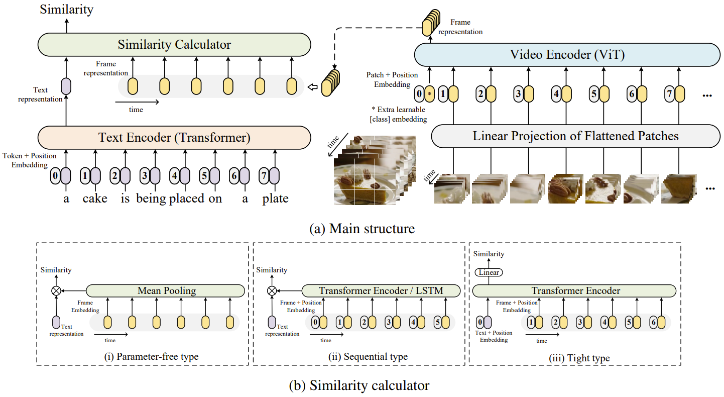 在巨量视频-文本对上进行对比学习,使编码器能将视频和文本映射到同一语义空间。