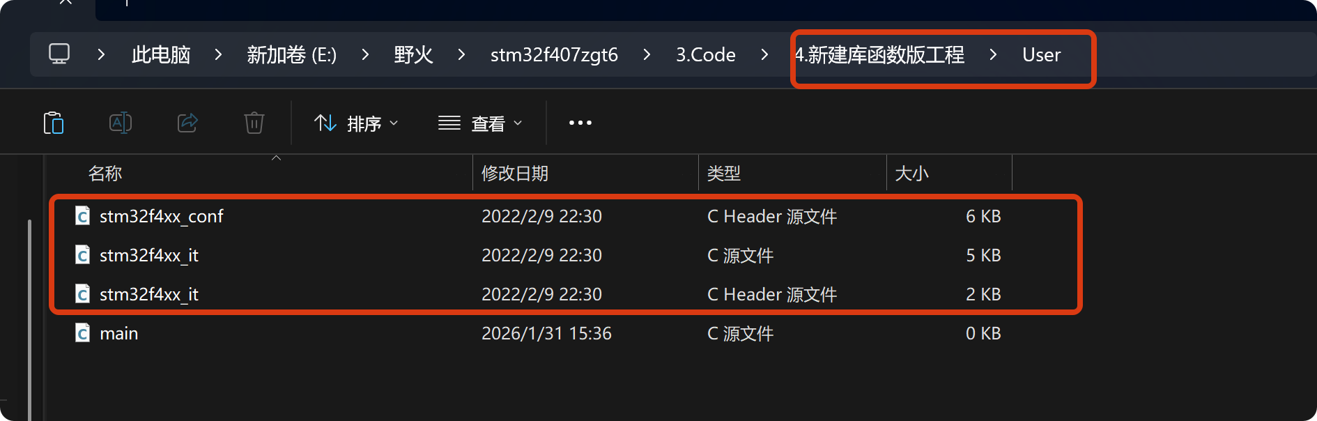 将固件库中官方提供的示例程序中,复制中断相关的函数移植到本地工程的User文件夹中