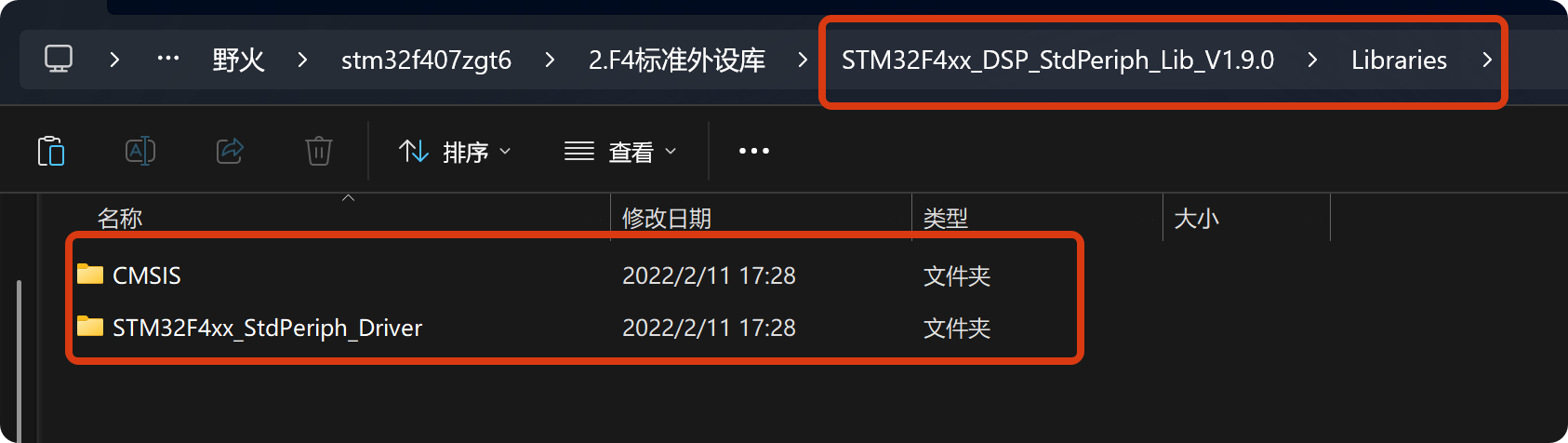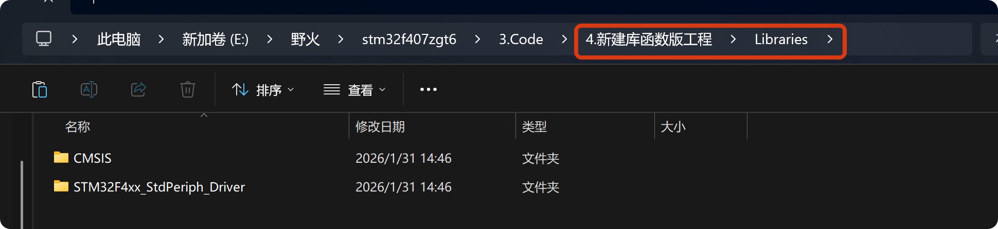 固件库中的CMSIS和Driver文件夹复制到工程中的Libraries文件夹中,