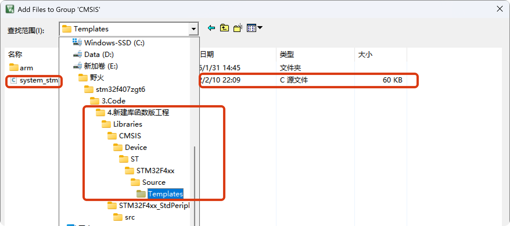 添加内核相关的文件,单片机系统初始化、配置时钟的文件