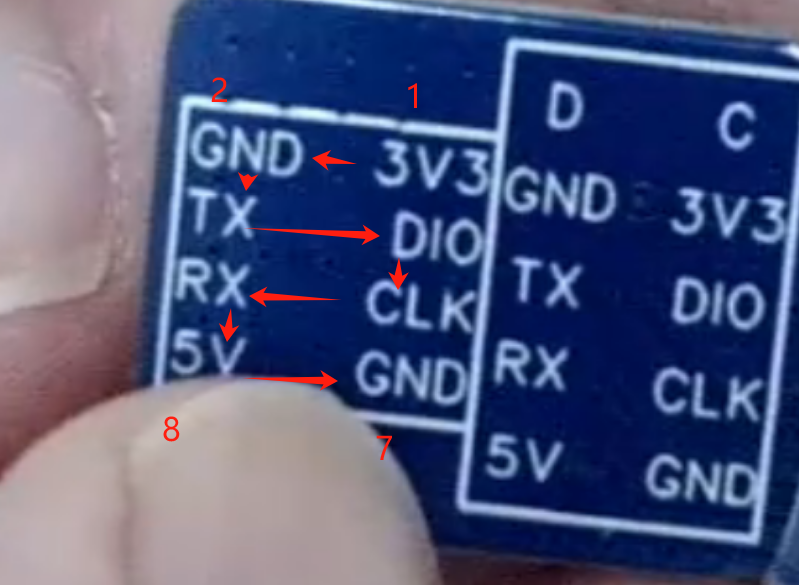 首先查看烧录器端的引脚定义。注意,我们看的是背面,因此正面来看右侧是1号引脚,顺序如上图。