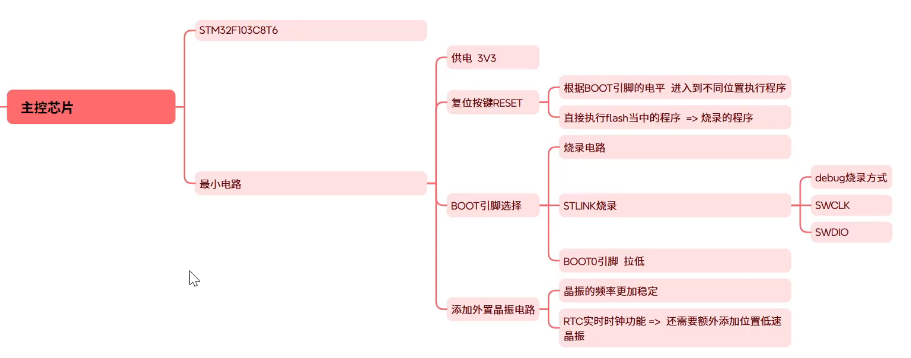 复位电路有个按钮,按下后就会重启单片机,进入某个内存块中开始执行程序,但是具体会从哪个内存块读取,取决于BOOT引脚。具体来说有三种配置方式,我们默认BOOT0 = 0 → 从 主 Flash 启动,其他方式参考《参考资料》。