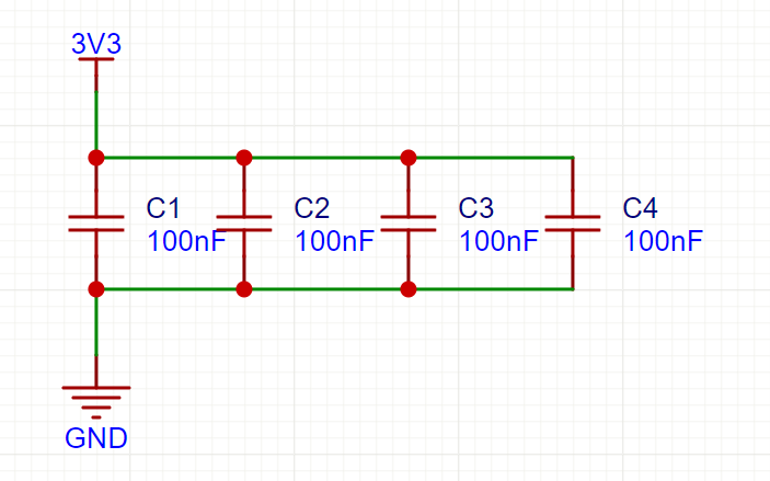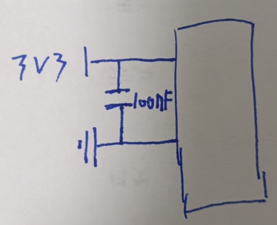 然后在电源上加一个小的滤波电容,因为DCDC输出的3V3并不稳定,有可能导致掉电重启,因此需要小电容来储能,在掉电的时候为其补充到3V3。