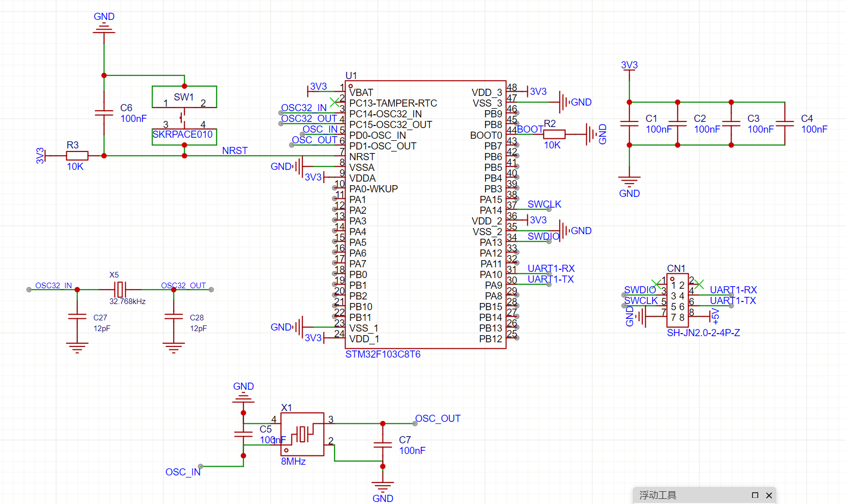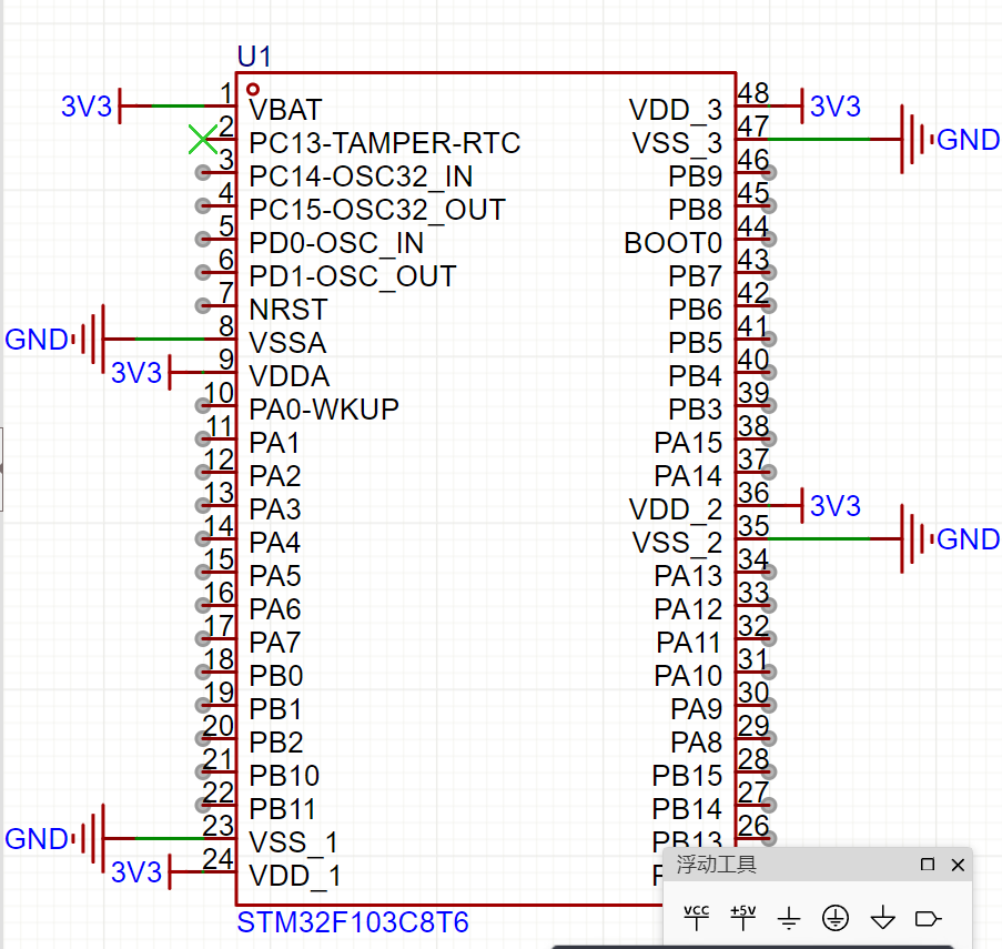 首先画电源模块,找到主控的VSS VDD以及VBAT,接入GND和3V3,这个VBAT是给备用区供电的,备用区用于掉电后仍然运行的程序,比如外部RTC(Real-Time-Clock)电路,用于解决时间戳不一致的问题(没有 RTC 的设备,每次上电时间都会回到 1970-01-01(Unix 时间起点),导致日志乱序、定时任务失效、摄像头时间戳错误等问题 。)。