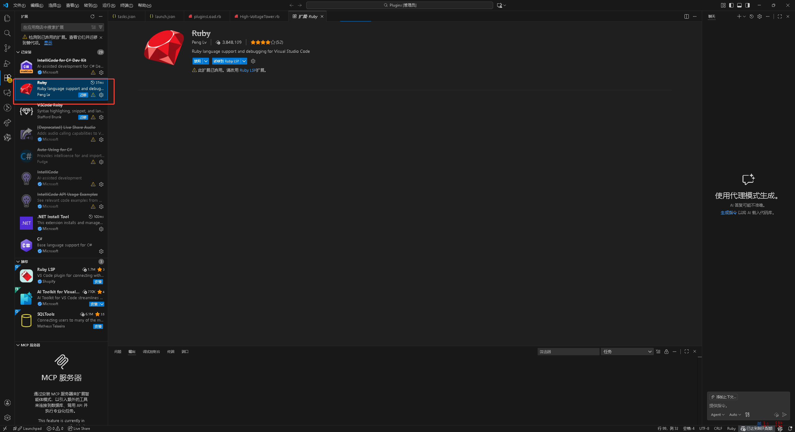 // 指定调试器类型为 Ruby。这告诉 VSCode 使用适用于 Ruby 的调试器扩展来处理此调试会话。