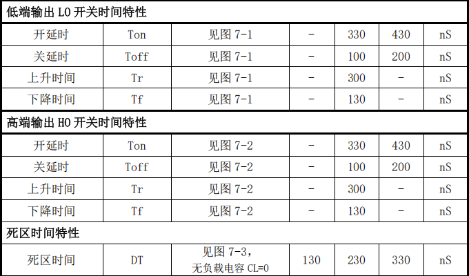 开关时间特性(典型值@VCC=15V, CL=10nF):