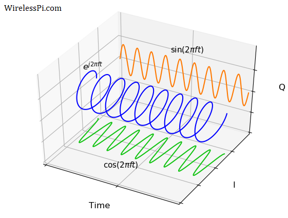 实部 cos ( 2 π f t ) \cos (2\pi f t) cos(2πft)可以看作是这个复正弦波在实平面(由时间和 I I I轴形成)上的投影。此外,虚部 sin ( 2 π f t ) \sin (2\pi f t) sin(2πft)可以看作是这个复正弦波在虚平面(由时间和 Q Q Q轴形成)上的投影。