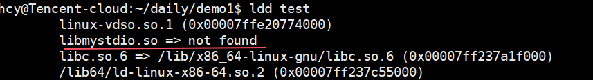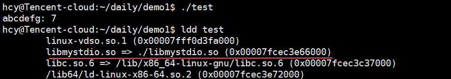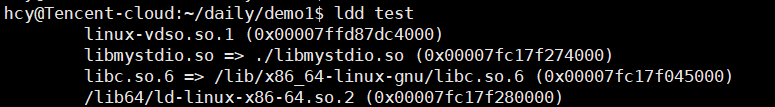动态链接其实远⽐静态链接要常⽤得多。⽐如我们查看下test这个可执⾏程序依赖的动态库,会发现它就⽤到了⼀个C动态链接库: