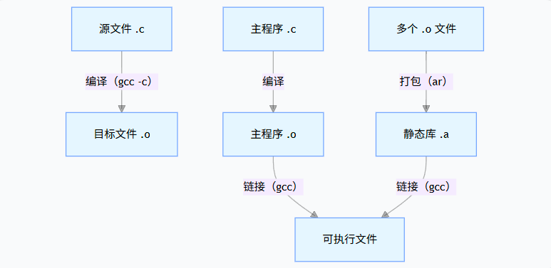 ar)把多个目标文件打包成静态库。 - 链接:编译器将主程序的目标文件和静态库中的相关代码复制并合并,生成最终的可执行文件。