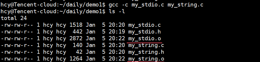 gcc -c my_stdio.c my_string.c # 生成 my_stdio.o 和 my_string.o