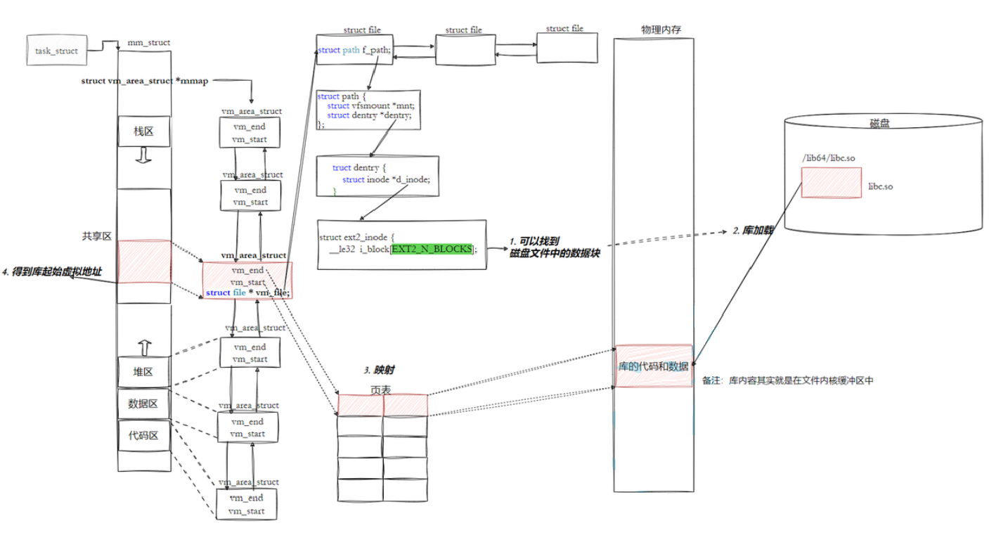 动态库也是⼀个⽂件,要访问也是要被先加载,要加载也是要被打开的,让我们的进程找到动态库的本质:也是⽂件操作,不过我们访问库函数,通过虚拟地址进⾏跳转访问的,所以需要把动态库映射到进程的地址空间中,如下图所示: