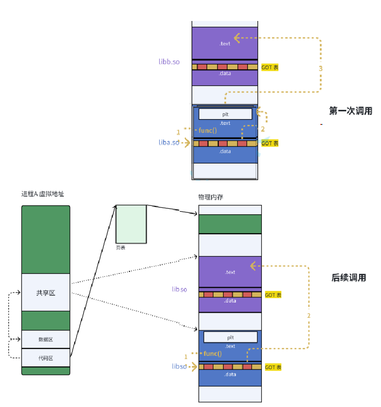 .text节,第一次调用函数时,通过 PLT 触发动态链接器解析符号地址,更新到 GOT,后续调用直接从 GOT 获取地址(延迟绑定)。