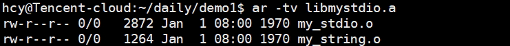 ar -tv libmystdio.a # 列出库中的.o文件,t=列表,v=详细信息