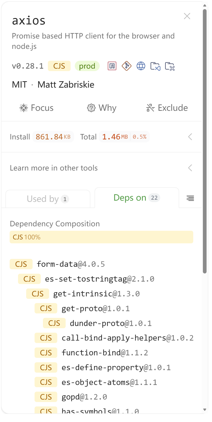 每个页面的左侧都会显示当前你选中的依赖相关信息,包括名称、用途(简介)、版本、仓库地址、开源协议、作者、引入大小、与其他依赖间的关系等