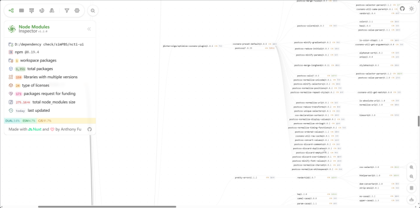 想要快速直观地查看前端引入依赖的各项信息,传统方式是通过命令行(如 npm ls、pnpm why)查看,信息显示单一且碎片化,没有足够的信息和美观的页面,操作繁琐,而通过Vue 团队成员 antfu 带来的Node Modules Inspector可以实现近乎完美的依赖信息展示效果,只需要简单一条命令就可以查看丰富的依赖相关信息。该工具无需安装,直接在命令行运行即可,使用npx启动: