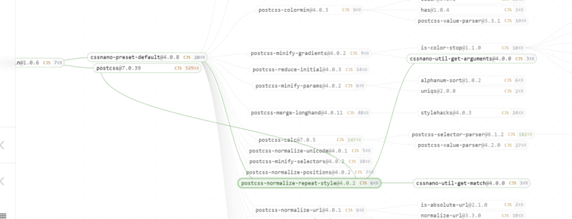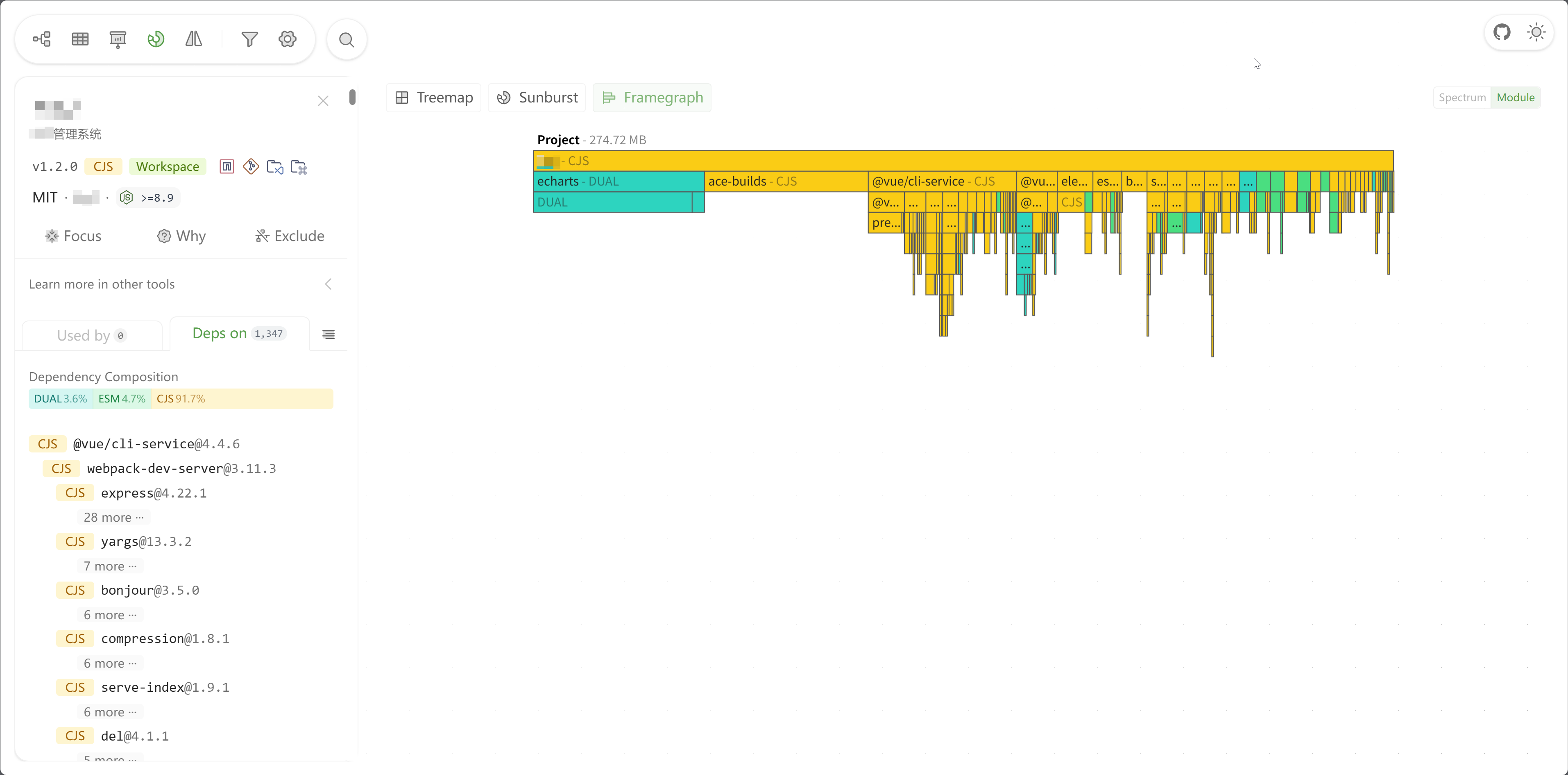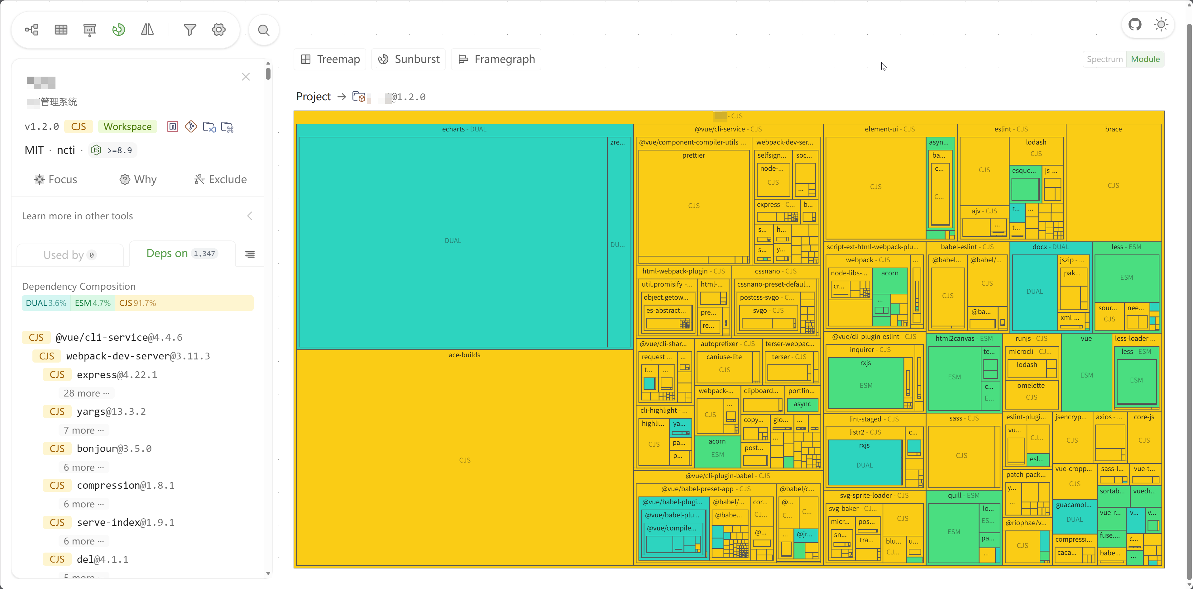 上方标签栏可以进行依赖的具体分类查看,分别为募捐、依赖关系、废弃依赖、多版本依赖、安装大小、发布时间、Node相关、开源许可、全部