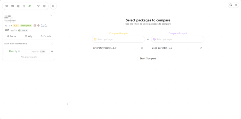 该功能可以直观对比任意依赖的结构、大小、引用关系等信息