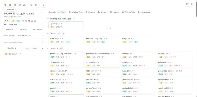 上方标签栏可以进行分类规则切换,分别为深度/层级、模块类型、依赖环境(开发/生产)、作者、开源协议、组织、来源,并且在深度/层级分类下,可以看到未被实际引用的冗余依赖Depth null