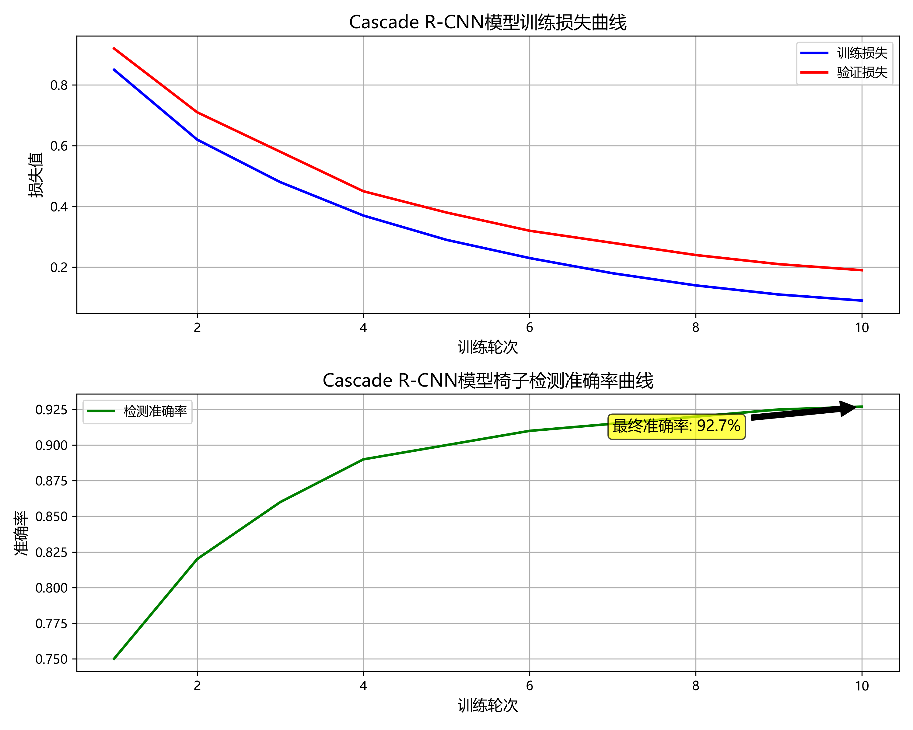 为了验证优化后的Cascade R-CNN在椅子检测任务上的效果,我们在自建的椅子数据集上进行了实验。该数据集包含10,000张图像,涵盖各种类型的椅子在不同场景下的表现。