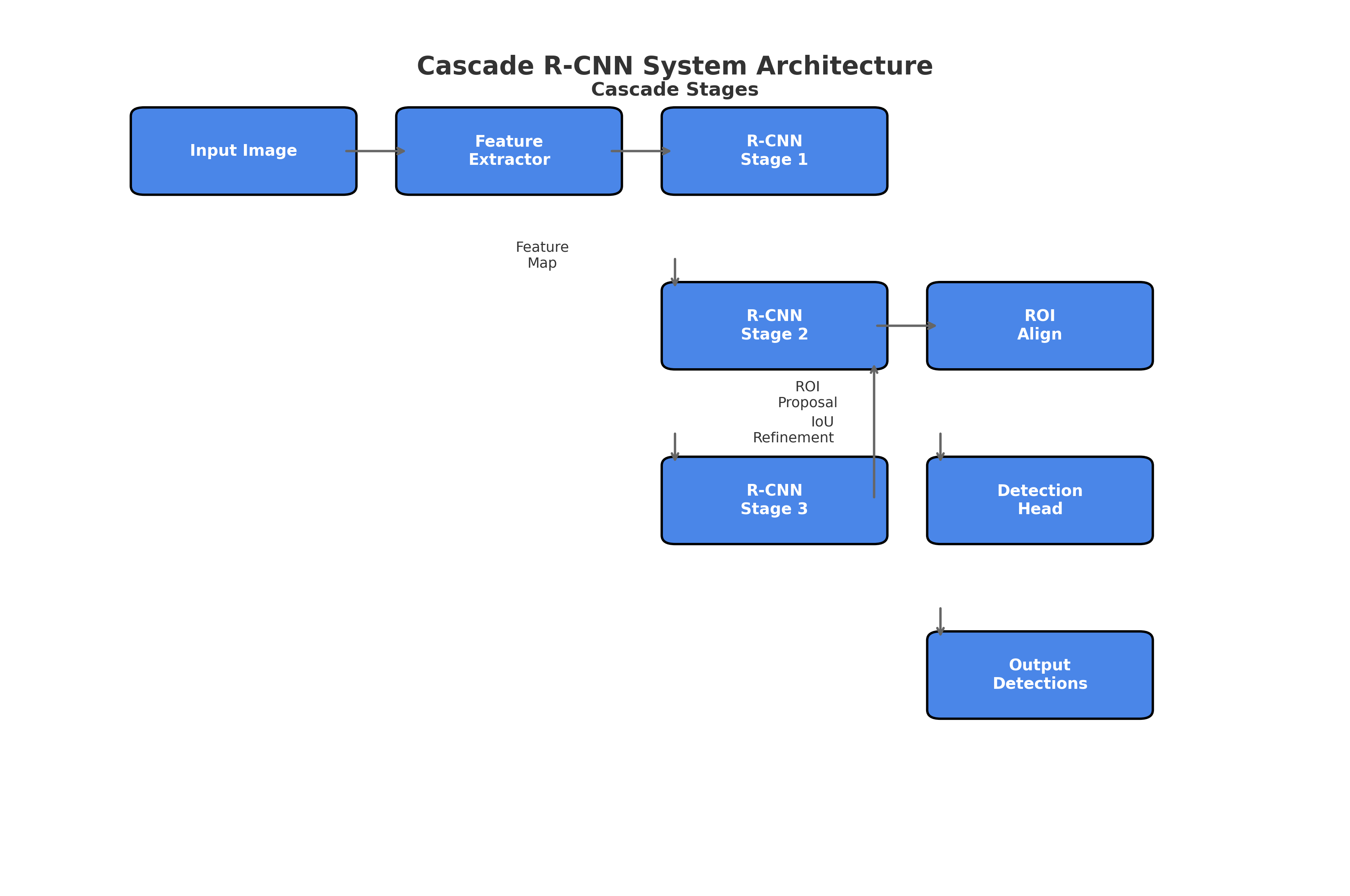 级联检测头是Cascade R-CNN的核心创新点。它由三个检测头组成,每个检测头都针对不同的IoU阈值进行训练。这种设计使得模型能够逐步提高检测框的质量,同时保持较高的召回率。🔄