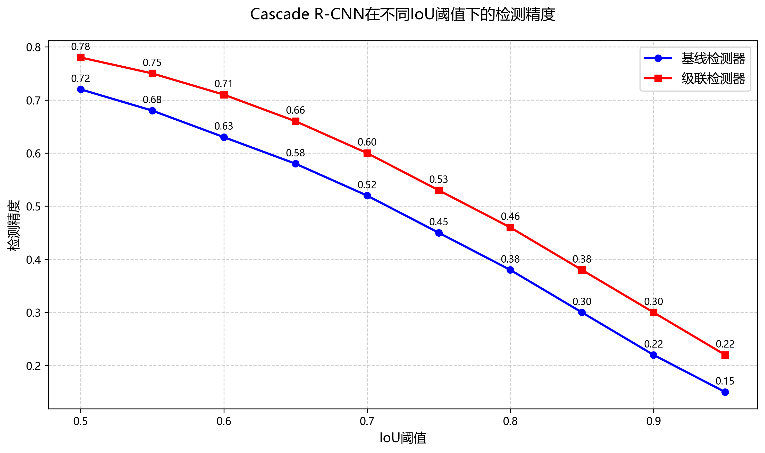 Cascade R-CNN最创新的地方在于其多阶段检测机制。传统方法通常只使用一个检测器,而Cascade R-CNN则采用了三个不同IoU阈值的检测器:
