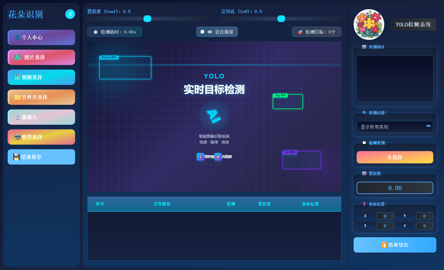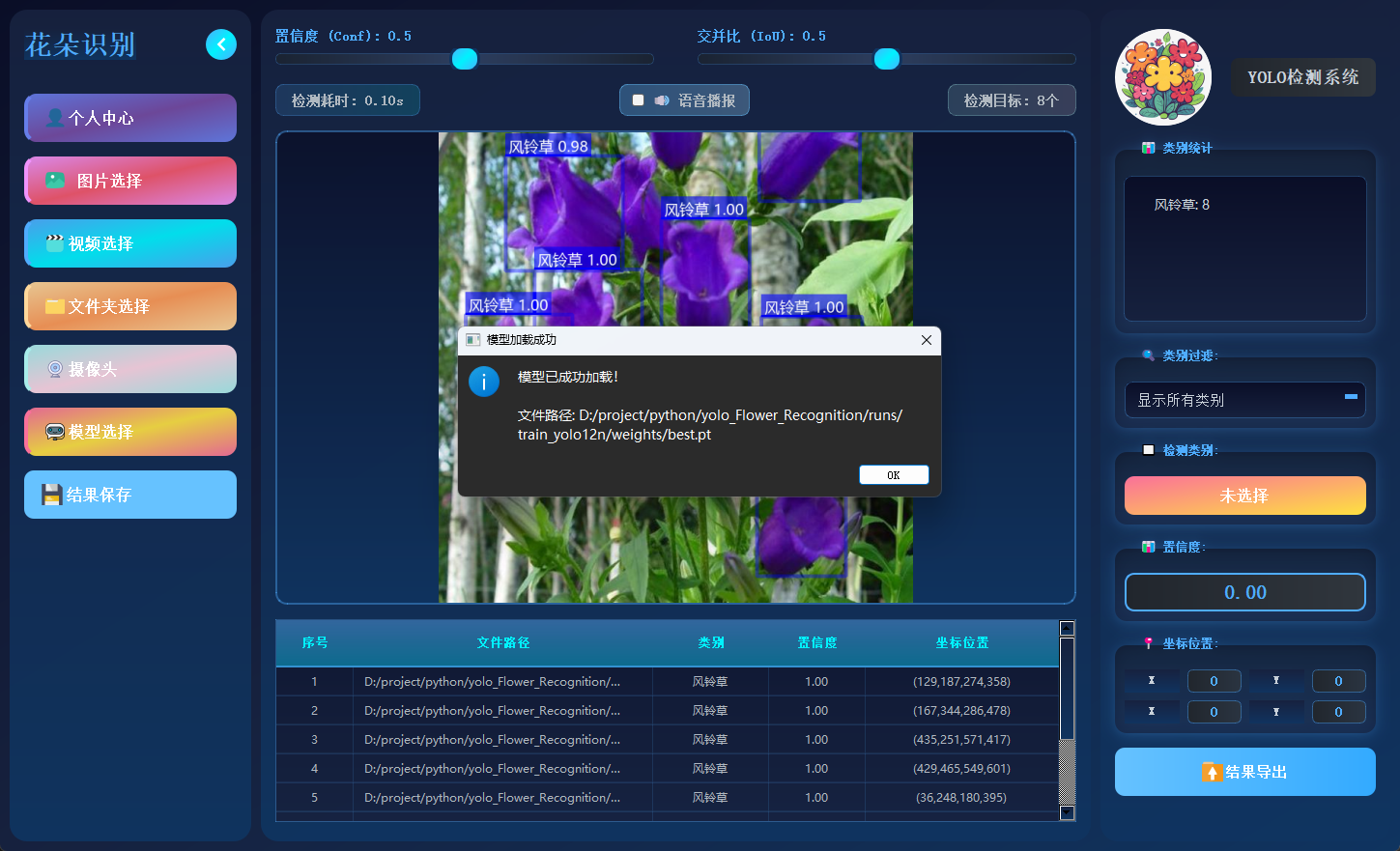 本系统可识别 103 种常见花卉 ,从山茶花、美人蕉、风铃草,到牵牛、矮牵牛、一品红等,覆盖广泛。系统界面采用三区布局,功能按钮、参数调节、实时展示与数据统计一应俱全,并支持 单图、批量图片、视频及摄像头实时流 检测,同时提供 模型切换、置信度与 IOU 调节、语音播报、结果保存与导出 等完整功能。此外,还包含 用户登录管理、脚本化无界面检测、以及完整的模型训练流程,并配套训练集与验证集(共计 5400+ 张图像),支持多模型(YOLOv8、YOLO12 等)训练与评估。