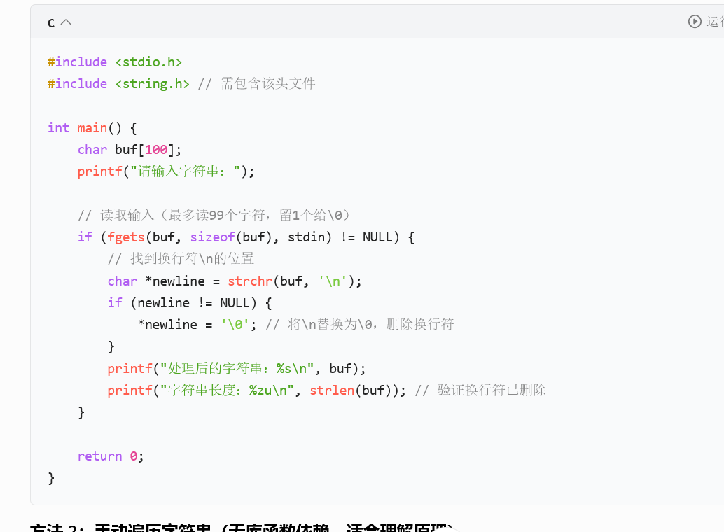 日常使用中,我们经常需要手动去掉 \n(比如用 strtok(buf, "\n") 或 buf[strcspn(buf, "\n")] = '\0'),就是因为 \n 会被 fgets 保留在字符串中,且在 \0 之前。
