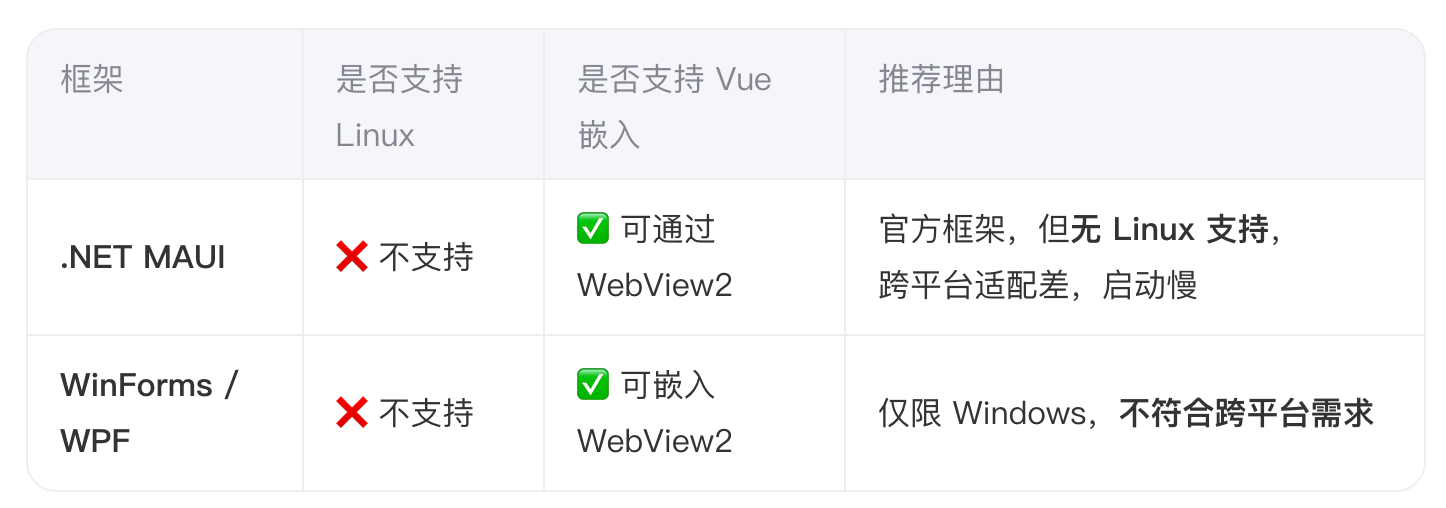 - 不支持 Linux(Blazor Desktop 仅官方支持 Windows 和 macOS)。