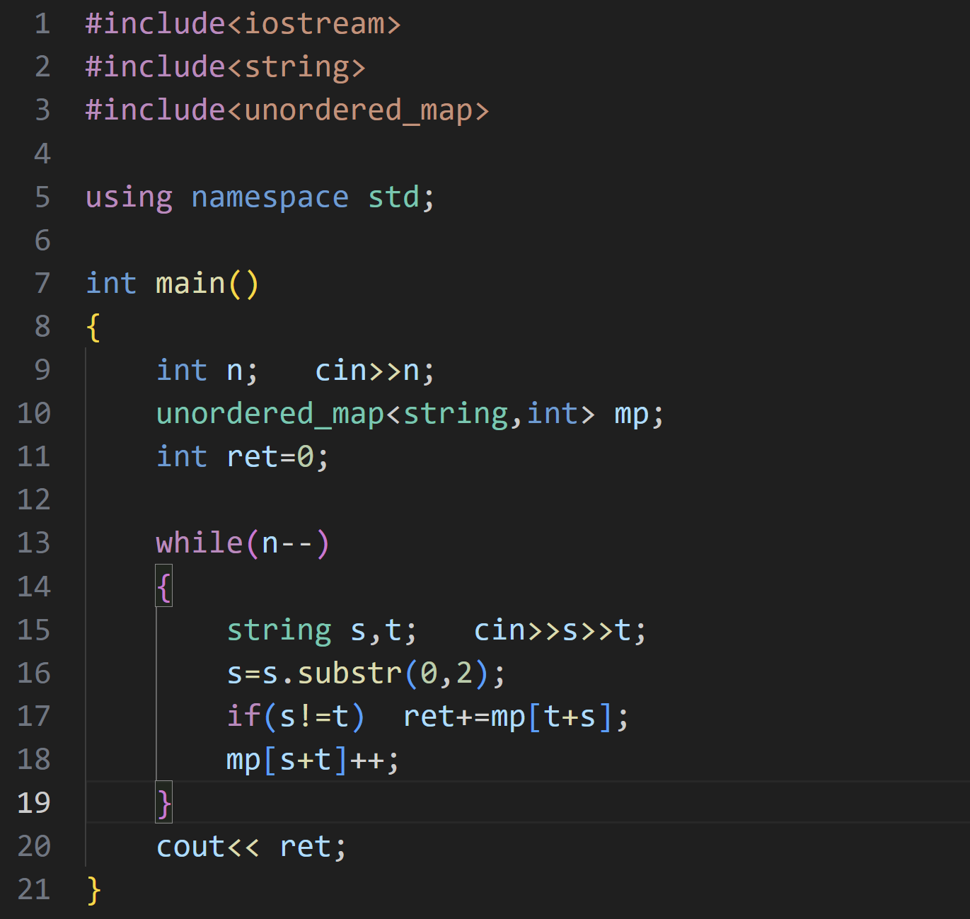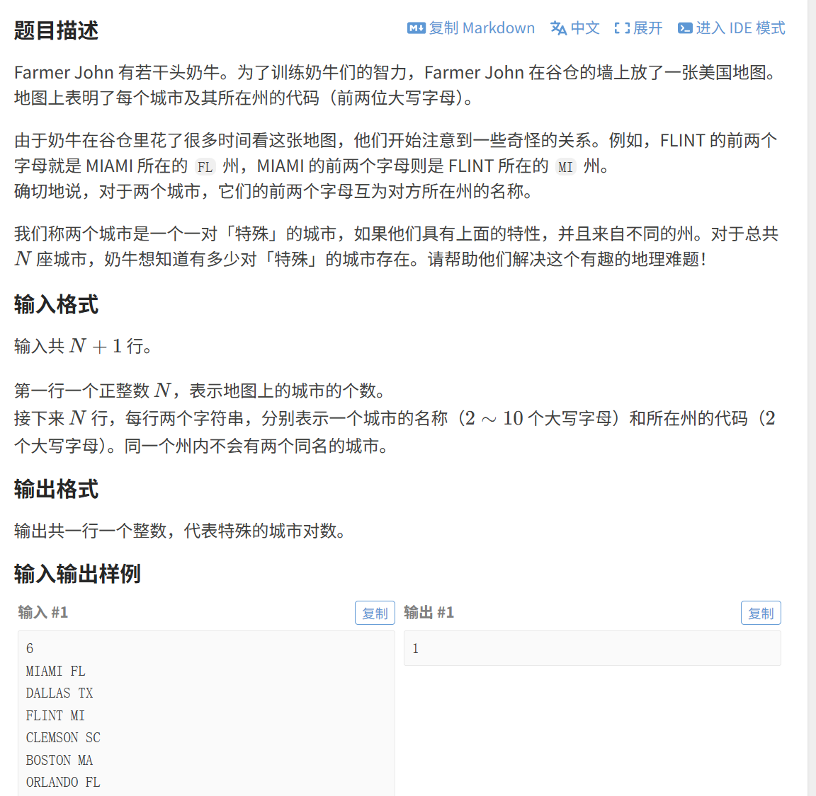 题目挺长的,简单来说就是要找出 "A城市名前两个字母"=="B州的编号" 并且 "B城市名前两个字母"=="A州的编号",这样 AB 成为一对,问一组中一共有几对