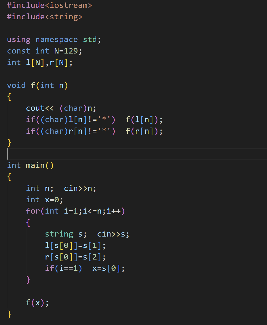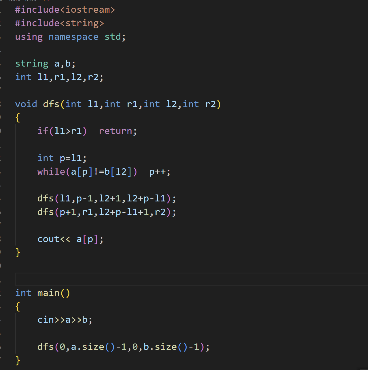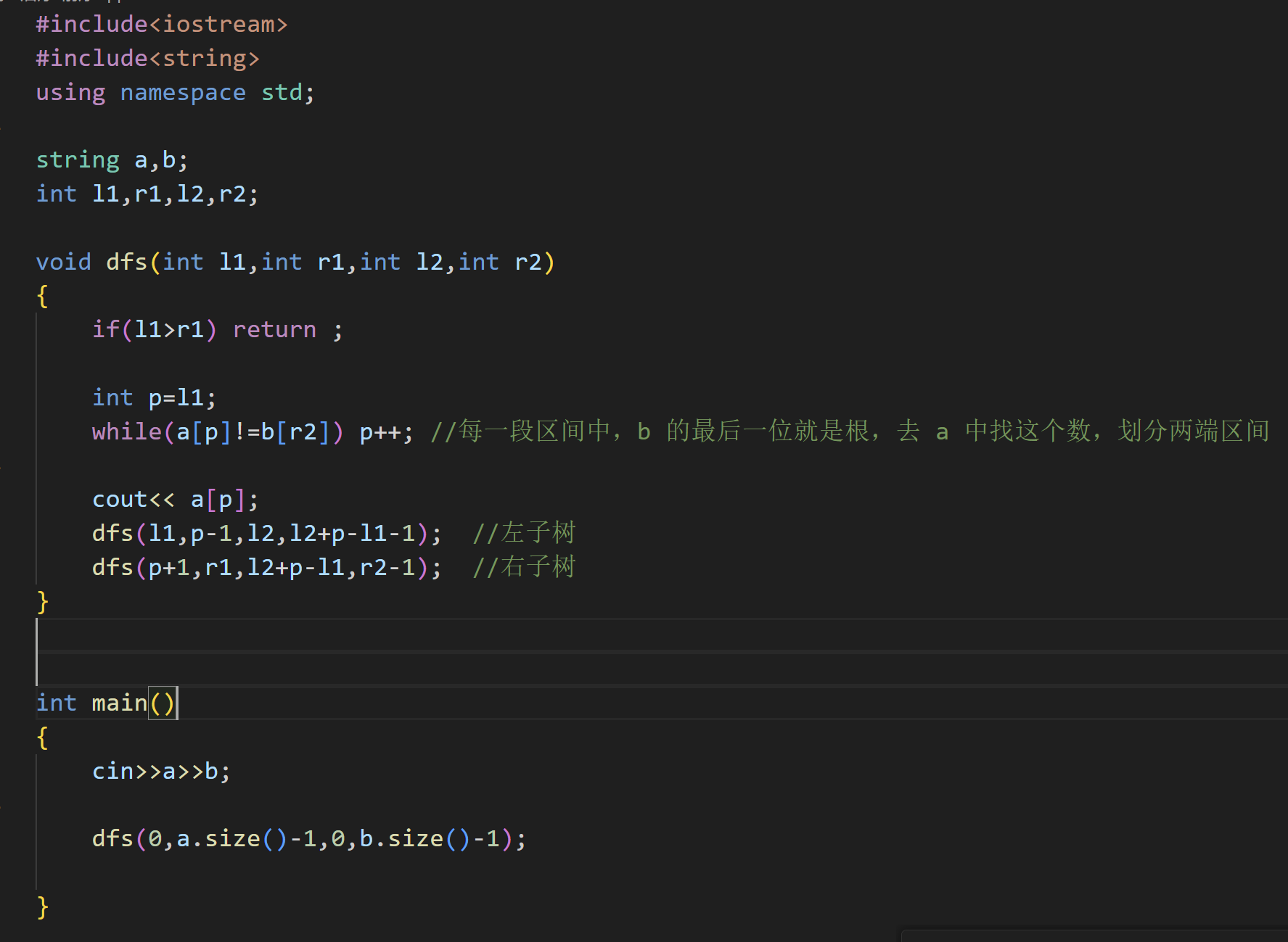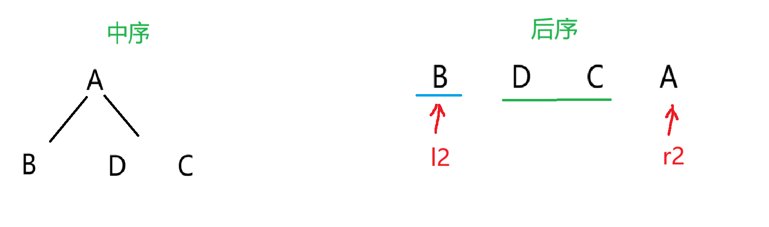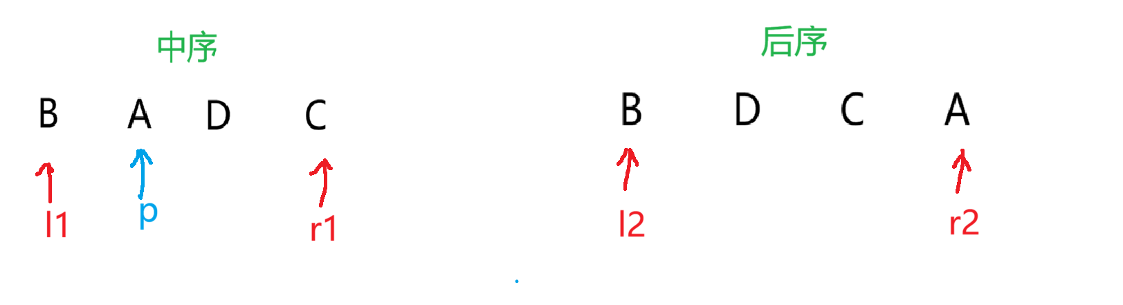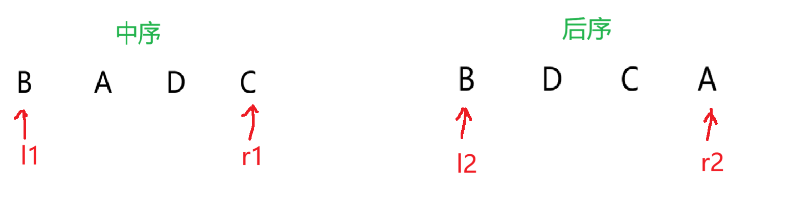 首先定义四个指针,分别指向两个字符串的首尾,此时 r2 指向的就是一个根节点,接着我们遍历中序的字符串,找到 r2 指向的 A 并将数组分成两个部分
