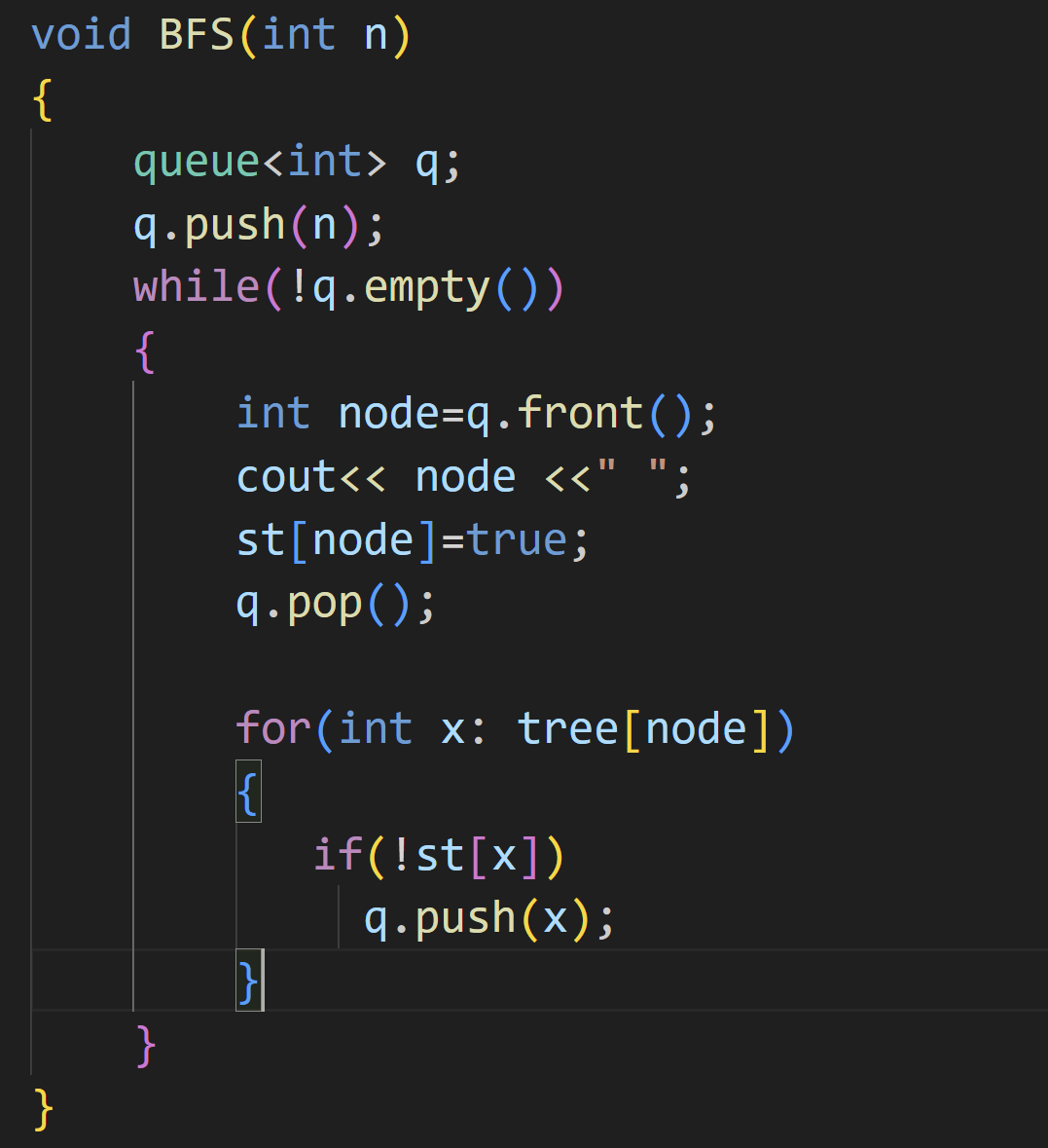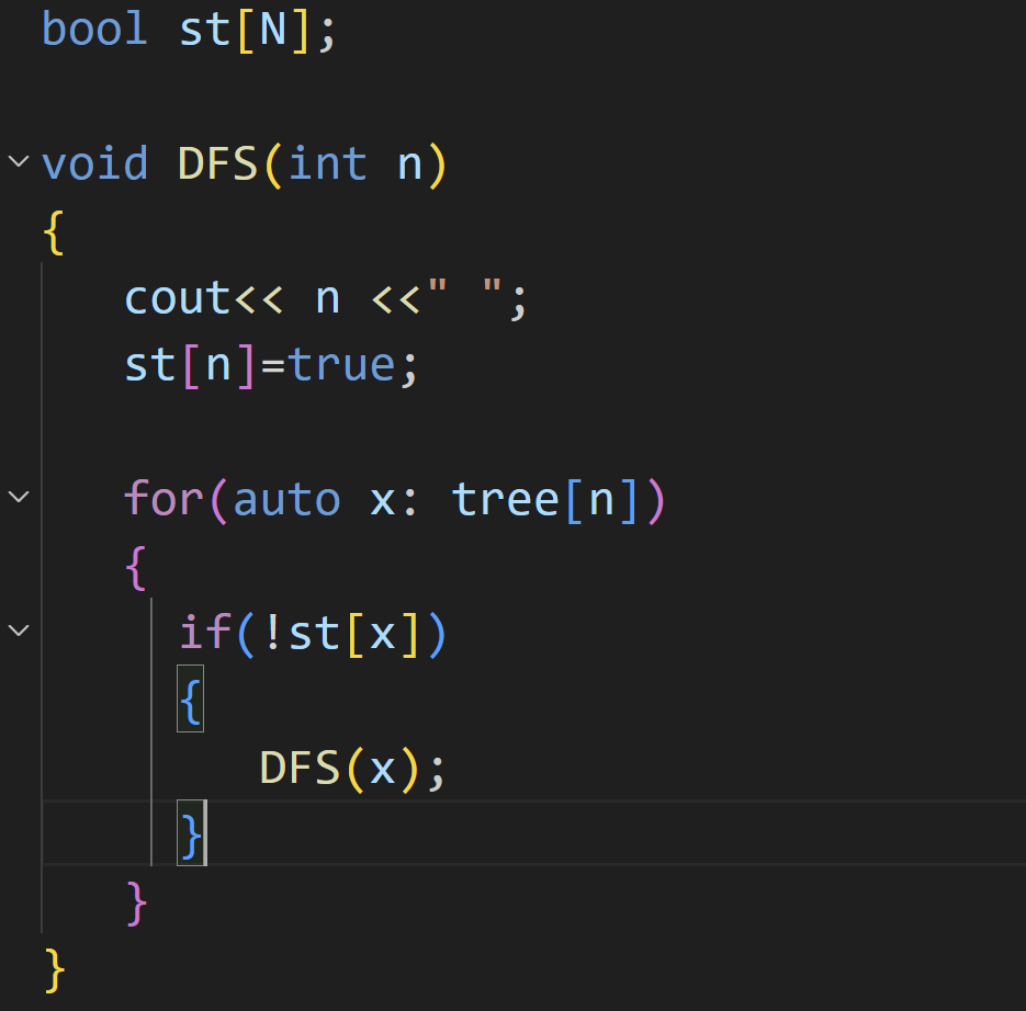 首先先输出对应的节点,然后将这个节点在布尔数组里面标记为真,表示此节点已经被访问过了,接着就是遍历这个节点的孩子节点,判断其是否被遍历过,如果未被遍历,那就调用自身函数