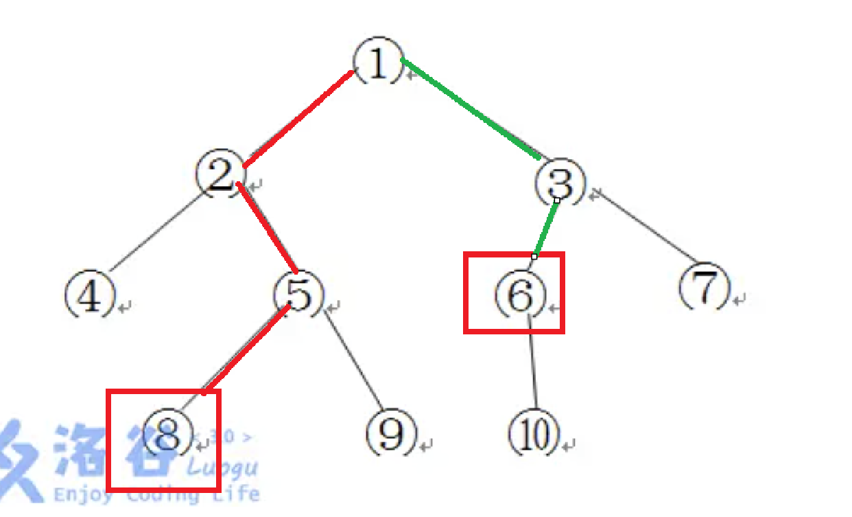首先我们要计算向根节点的边数,可以从 u 节点开始,一直向上走知道到达根节点,期间记录下每个节点到达 u 节点的距离,定义一个 dis 数组,为了完成向上查找的操作,一开始创建二叉树的时候我们定义一个 fa 数组来记录每一个节点的父亲是谁