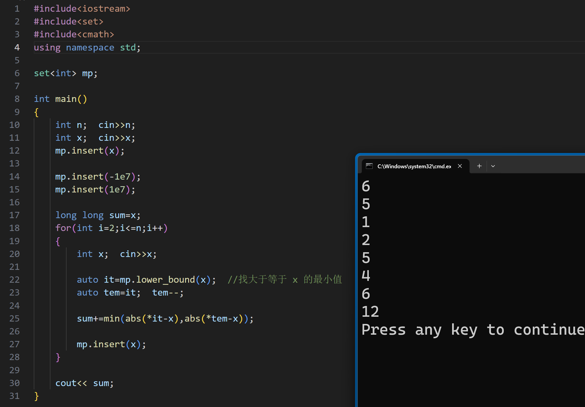 还记得 lower_bound(x) 函数吗,他可以查询到大于等于 x 的一个数,返回迭代器 it,那么 it-1 就是离 x 最近的并小于它的数,我们只需要比较这两个数谁离 x 更近就行