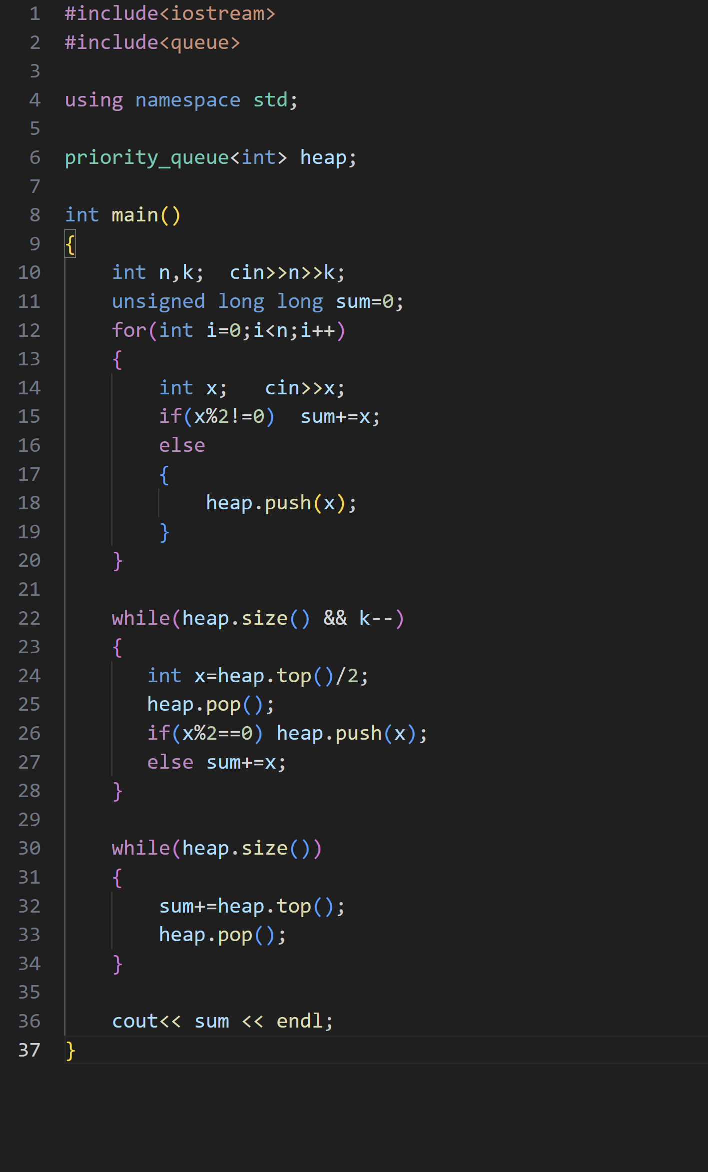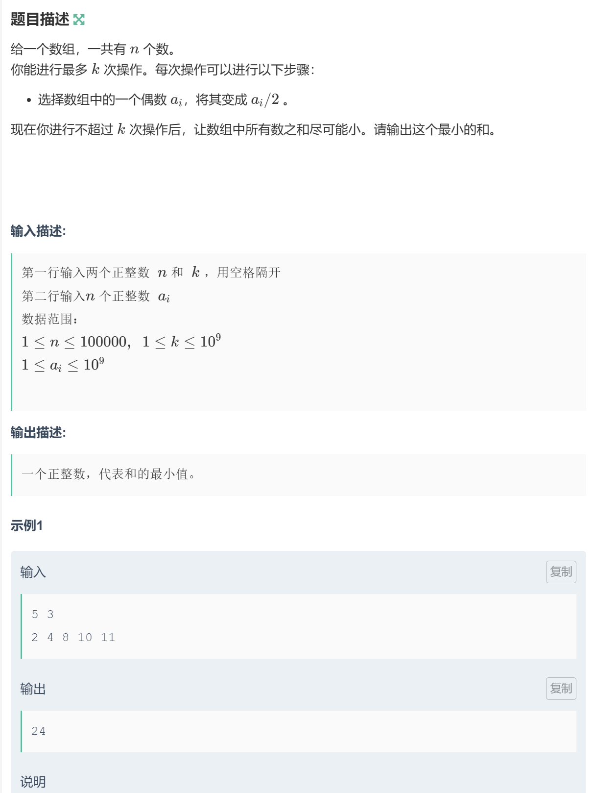 要让最后的和最小,那我们就要在 k 次的范围内每次选最大的偶数,将其除以2