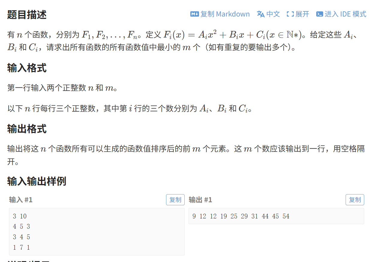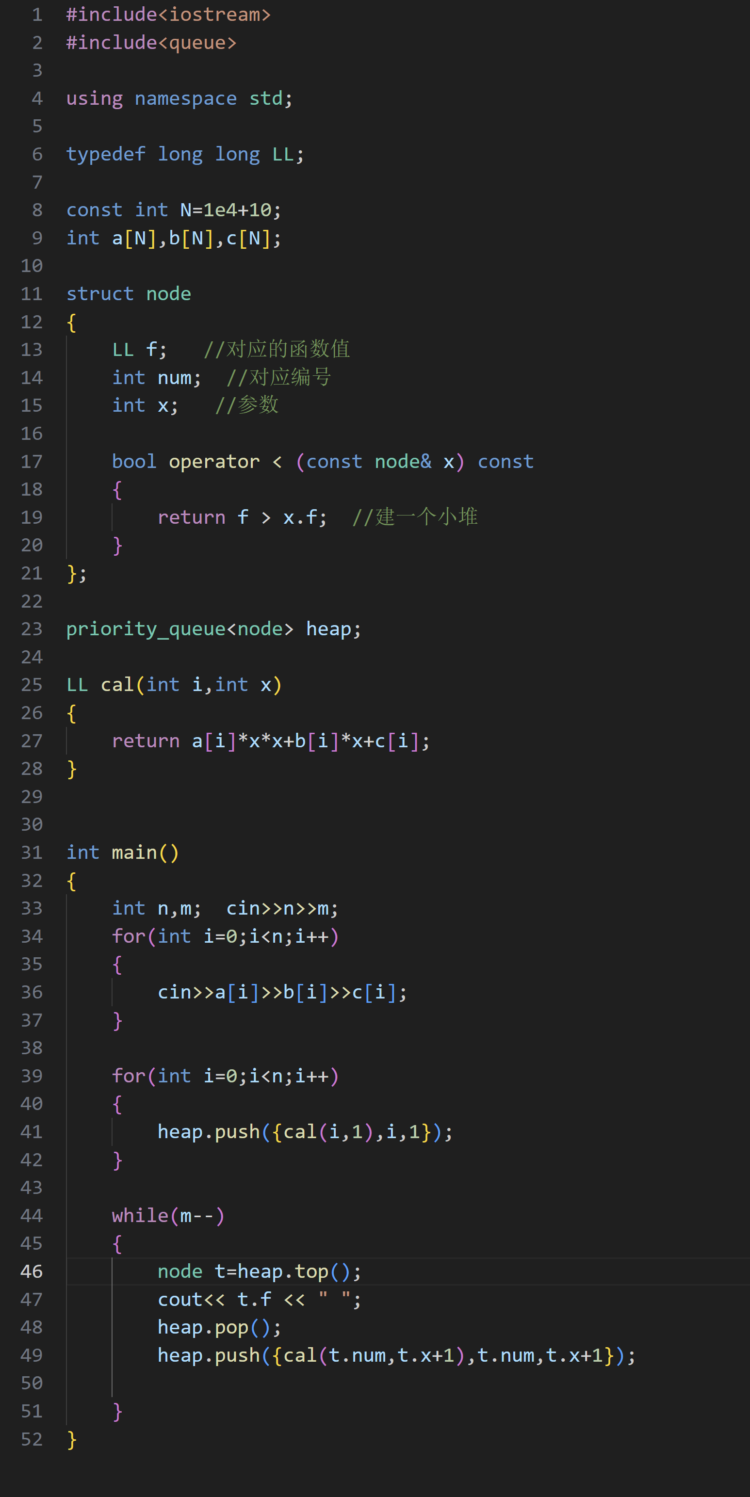 注意到题目中说,x 值是自然数,对于每一个函数,其就是单调递增的。我们就可以利用这个性质,先让 x==1 时函数值入堆,比较出最小的,然后单独让此自变量 +1 ,继续比较