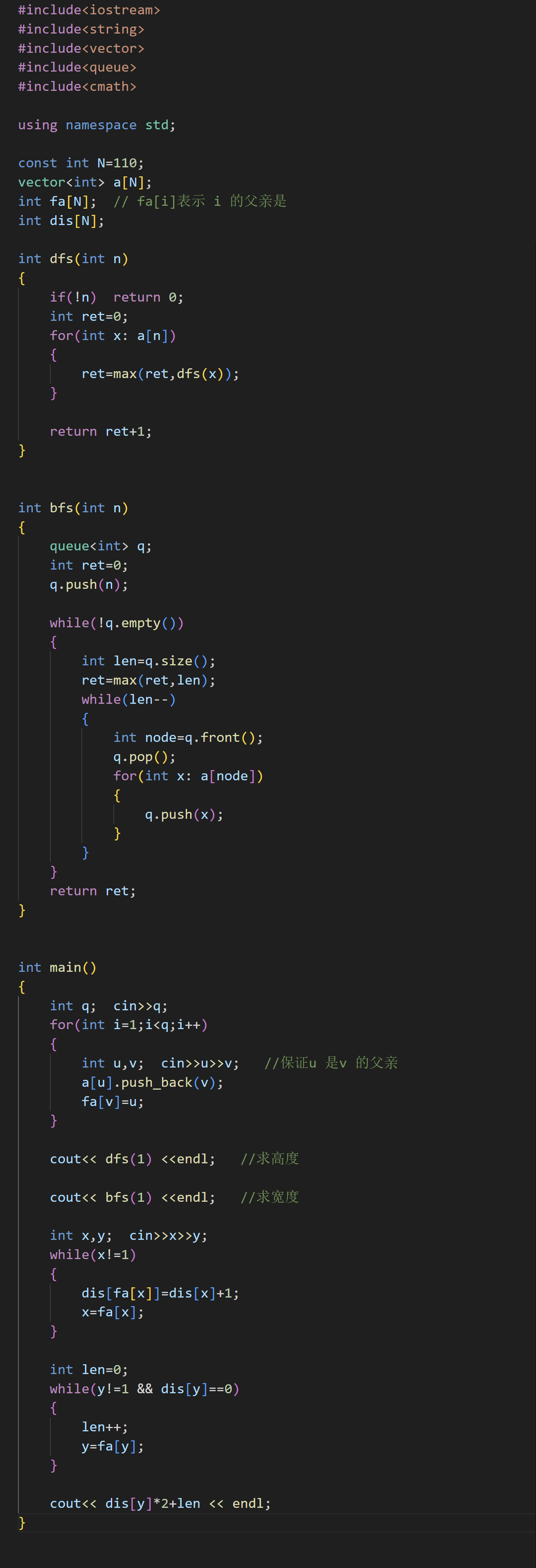 要求向叶节点的边数,可以从 v 节点开始,向上遍历,如果过程中有个节点的 dis 对应的值不为 0 ,说明两种边就相遇,可以进行最后计算