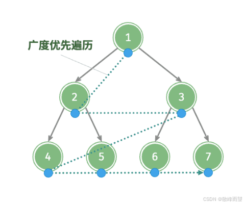 - 当队列不为空时,拿出队头元素,访问,然后将队头元素的所有孩子入队,同时打上标记;