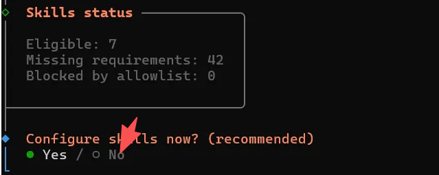 Skills配置这里可以选No, 等安装好后,可以在后台界面去配置