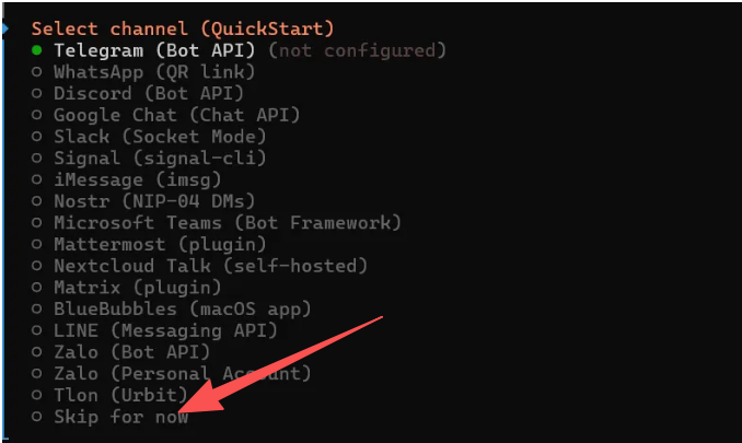 但是飞书不在这里面,点击Skip for now, 跳过配置