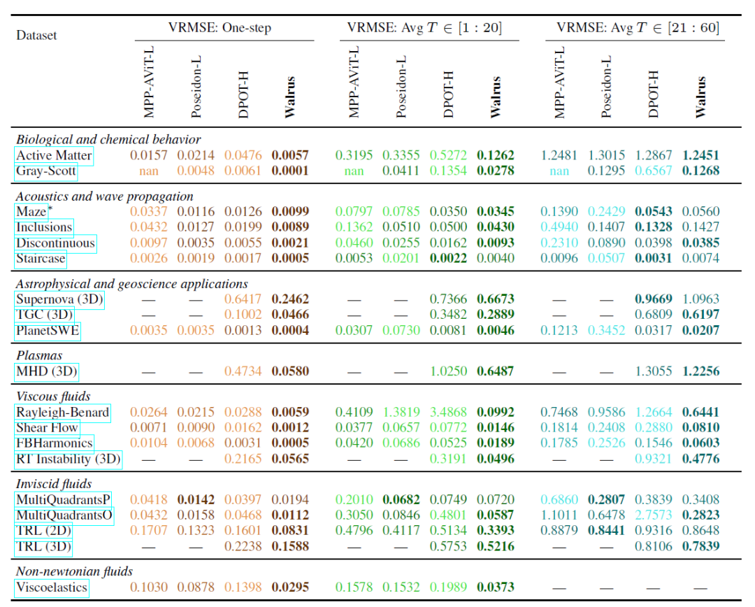 相比之下,DPOT 在声学和线性波传播任务中表现接近 Walrus,Poseidon 在无粘流任务中表现优异,但 Walrus 通过广泛预训练和通用架构,在大多数任务上都取得了竞争力甚至更优的结果。