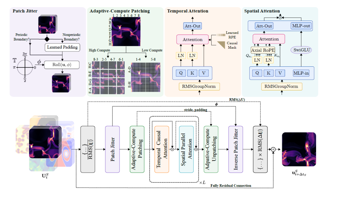 * 解决了当前连续介质动力学基础模型的若干局限性,例如成本自适应、稳定性以及在原生分辨率下对高度异构训练数据的高效训练;