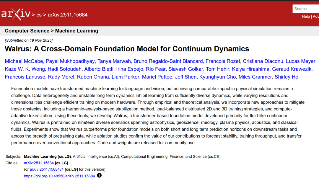 相关研究成果以「Walrus: A Cross-Domain Foundation Model for Continuum Dynamics」为题,已发布预印版于 arXiv。
