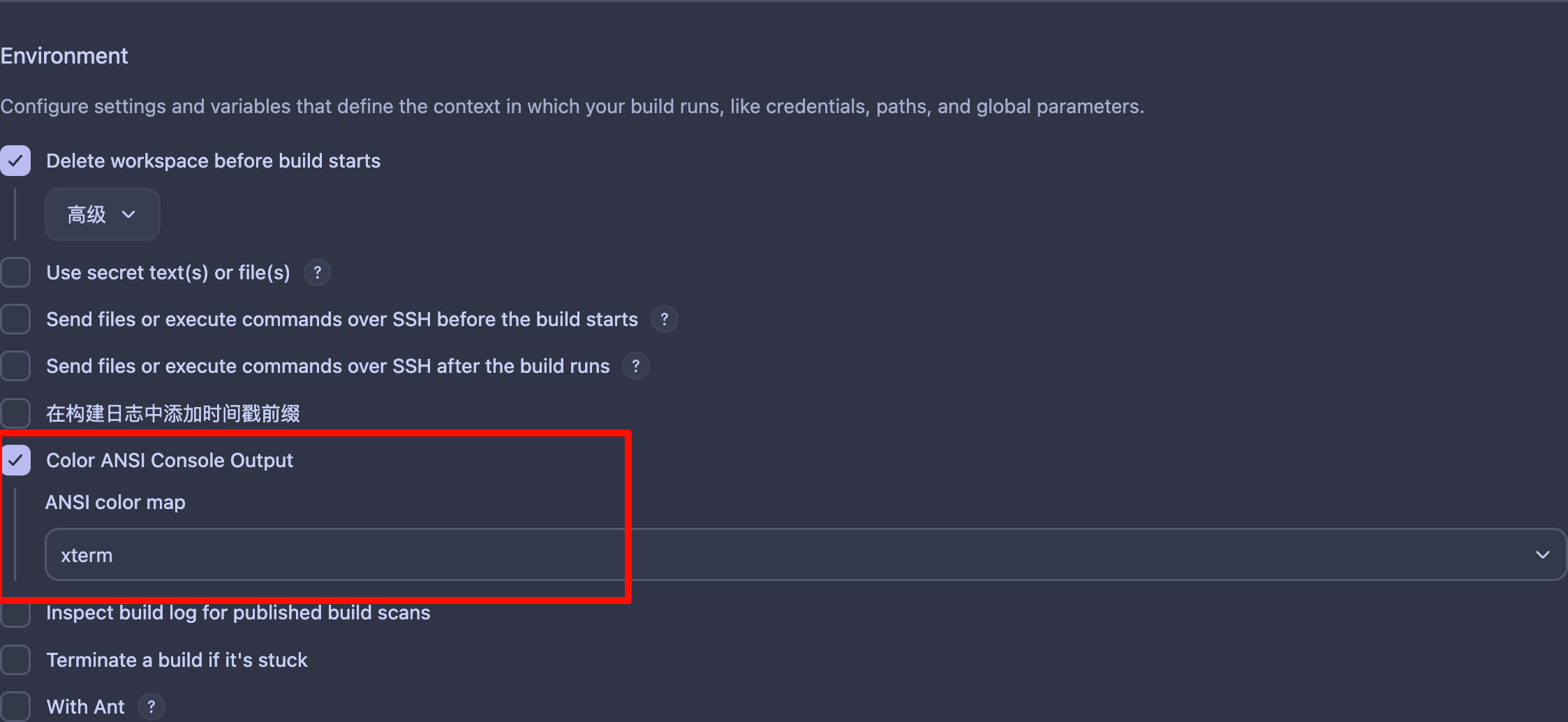 👉 真正相关的是「Build Environment」里的 AnsiColor 选项。