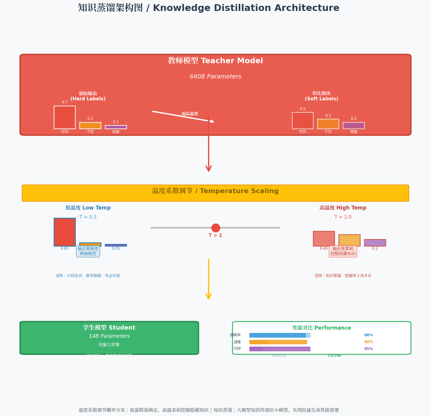 图示说明:上方为教师模型(英文标注"660B Parameters"),中间为温度系数调节过程(中英双语标注),下方为学生模型(中文标注"14B Parameters")及性能对比。