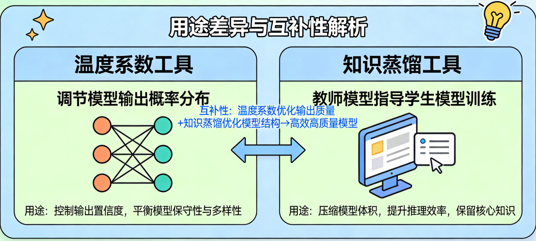 大模型训练完成后,还需要通过一些优化工具,调整其输出效果、实现轻量化部署,满足不同场景的需求------训练好的基础大模型往往参数庞大、输出风格固定,无法直接适配所有实际应用,温度系数 和知识蒸馏 是最常用的两种优化工具,二者用途不同、互补性强,分别解决"输出适配"和"部署落地"两大核心问题。