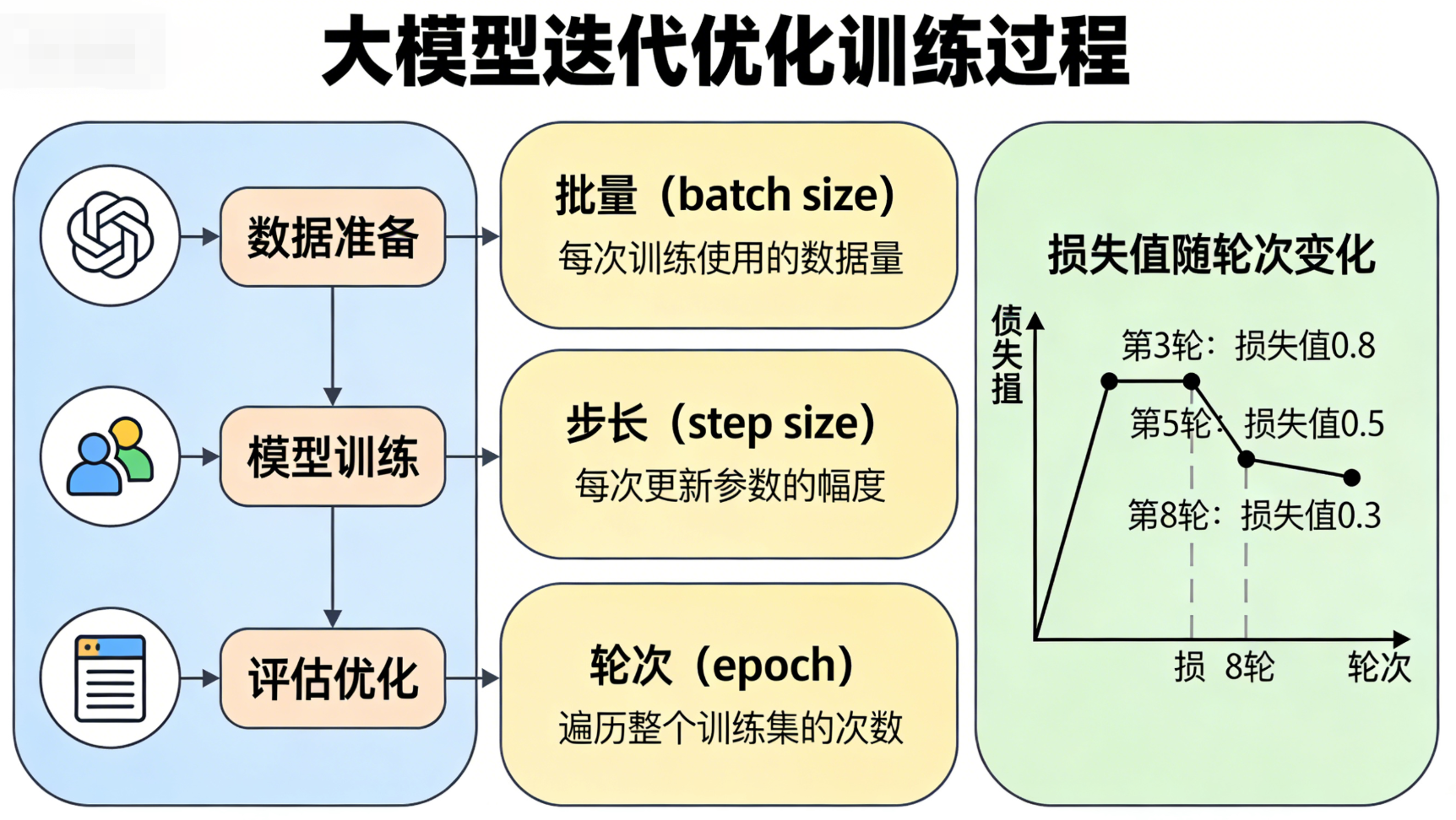 大模型的训练是一个"迭代优化"的过程,核心是通过不断调整参数,降低模型预测误差,本质就是让模型反复"学习"训练数据中的规律,核心概念包括批量、步长与轮次,三者相互关联、协同作用。