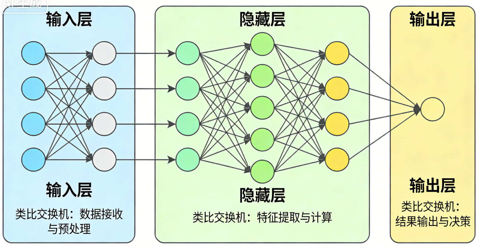 - 输出层(Output Layer):输出处理结果的"信号出口",对应接收数据的服务器上联的接入层交换机。比如识别图片后输出"猫""狗"等分类结果,处理文字后输出应答内容。