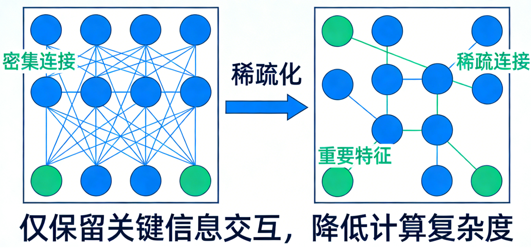 - 每个Token仅计算与"重要Token"(如相邻Token、语义相关Token)的权重;