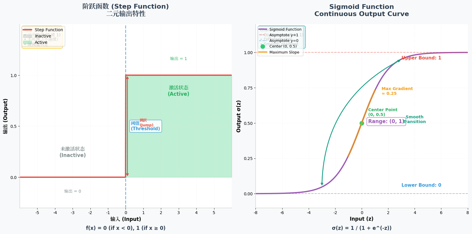- 核心特性:如同电路开关,只有"激活"和"未激活"两种状态,完美模拟早期对大脑神经元"阈值触发"的理解。